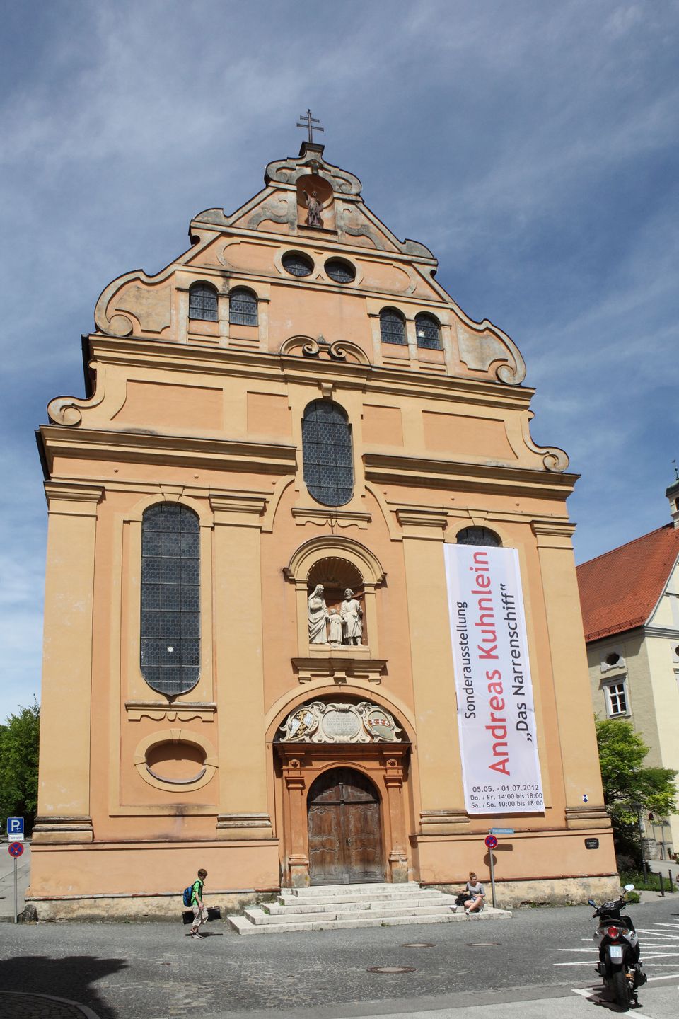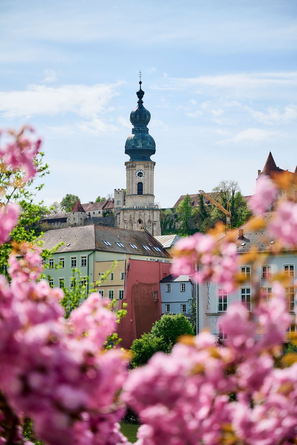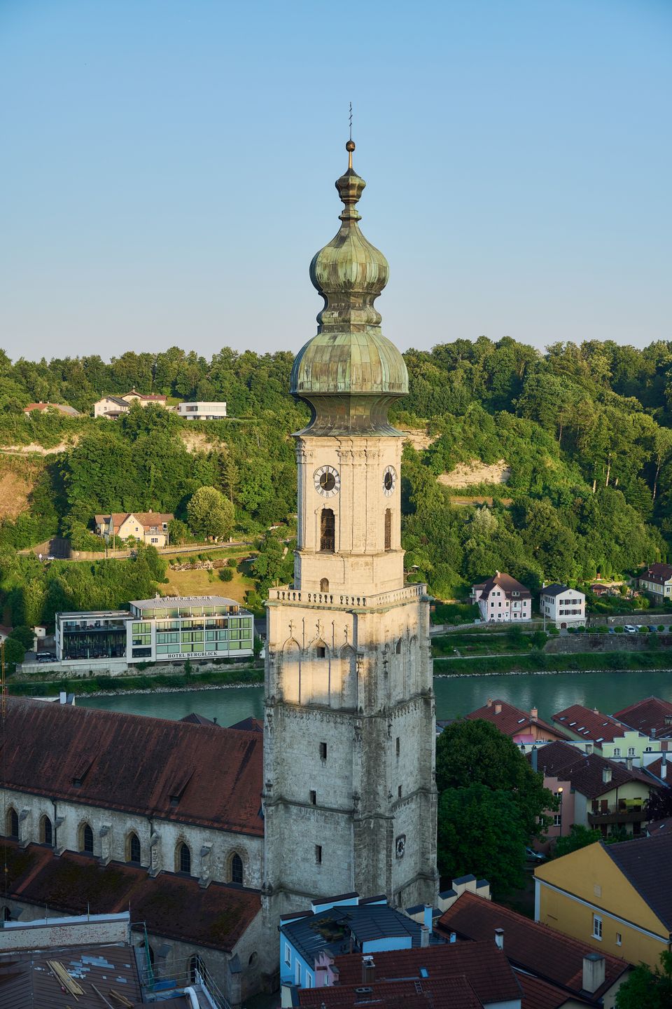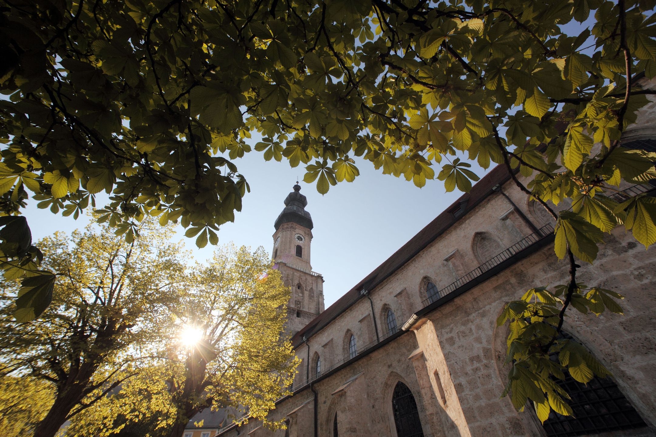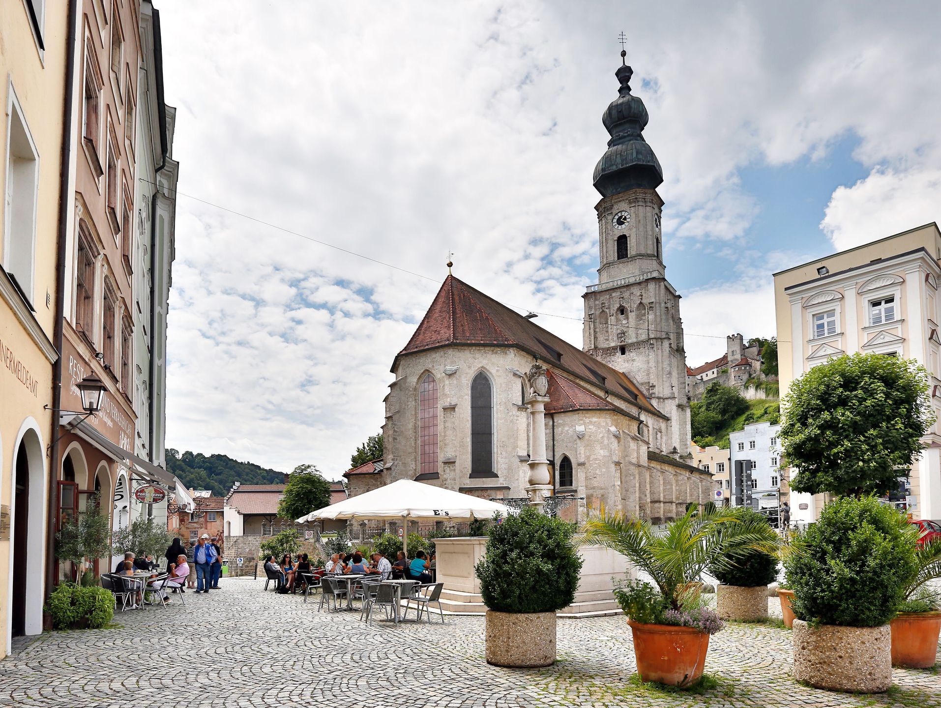 Farbenfrohe Giebelhäuser mit Renaissance-, Barock- und Rokokofassaden säumen den großzügigen Stadtplatz. Am nördlichen Ende zeigt die frühbarocke Studienkirche St. Josef heute zeitgenössische Kunst, gleich daneben liegt die Barock-Aula des Kurfürst-Maximilian-Gymnasiums. Es folgen das Taufkirchen-Palais, das Stadtsaalgebäude und das Rathaus ‒ dazwischen Biergärten, Eisdielen, Cafés und Terrassenlokale. Den südlichen Abschluss des Platzes markiert die Stadtpfarrkirche St. Jakob mit ihrem 79 Meter hohen barocken Zwiebelturm.