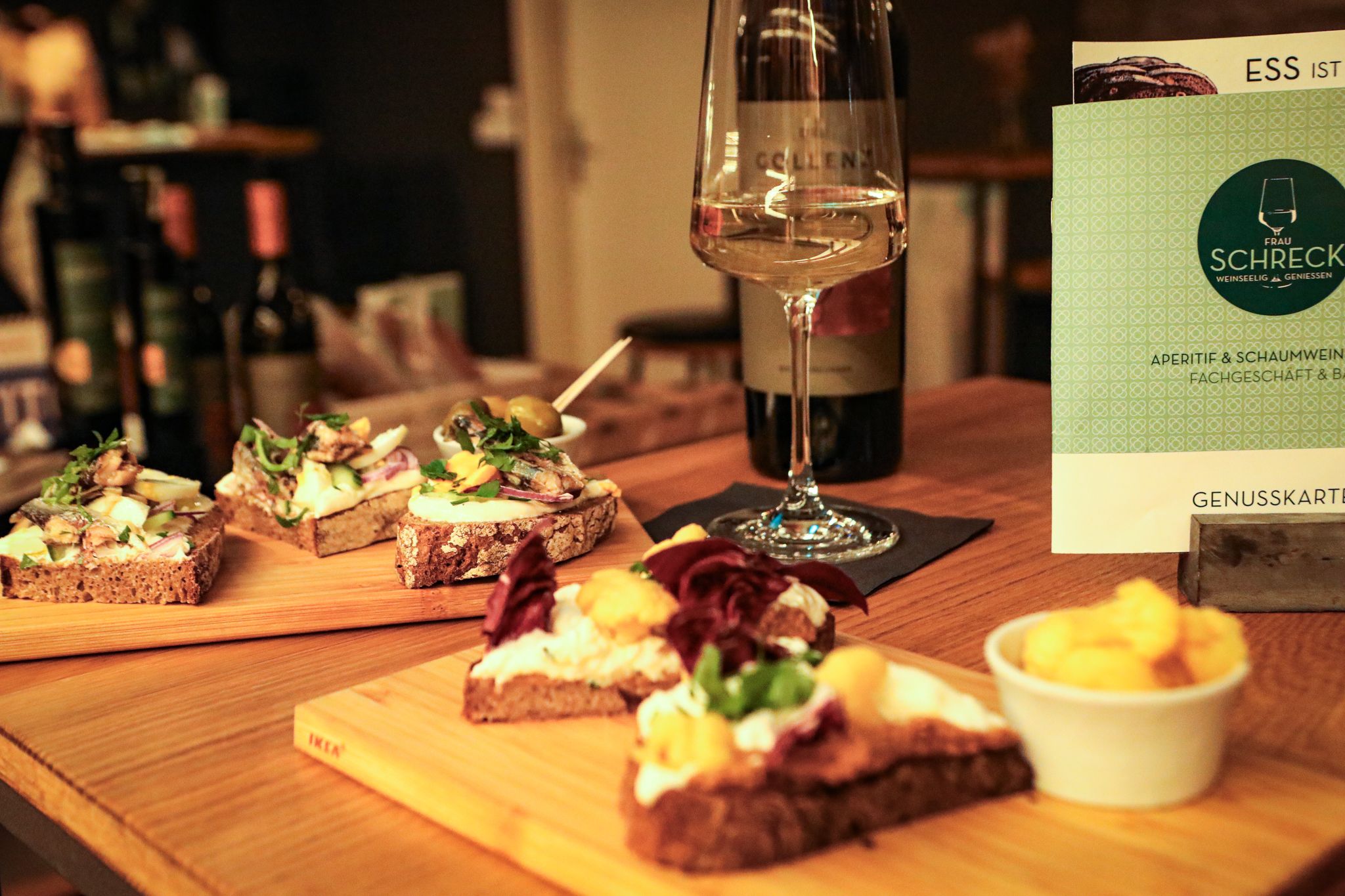 In Ländern wie der Schweiz und Frankreich ist der Aperitif oder Apéro fester Bestandteil des familiären und gesellschaftlichen Miteinanders. Man trifft sich, um auf die eigentliche Mahlzeit anzustoßen und sich mit Kleinigkeiten “warm zu essen”. FRAU SCHRECK ist genau so ein geselliger Treffpunkt. Natürlich könnt ihr bei uns auch den ganzen Abend in lockerer Atmosphäre leckere Weine, Wermuts, Sprizzgetränke oder andere Drinks mit oder ohne Alkohol genießen. Dazu bieten wir eine abwechslungsreiche Karte an kleinen, kalten oder warmen Snacks.